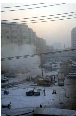在冰面往南十余米處,宋家灘供熱站的維修人員正打開馬路中間的井蓋修理管道。據維修人員講,破裂的管道是二三十年前的老供熱管道,因年久失修,于12月23日凌晨破裂。
